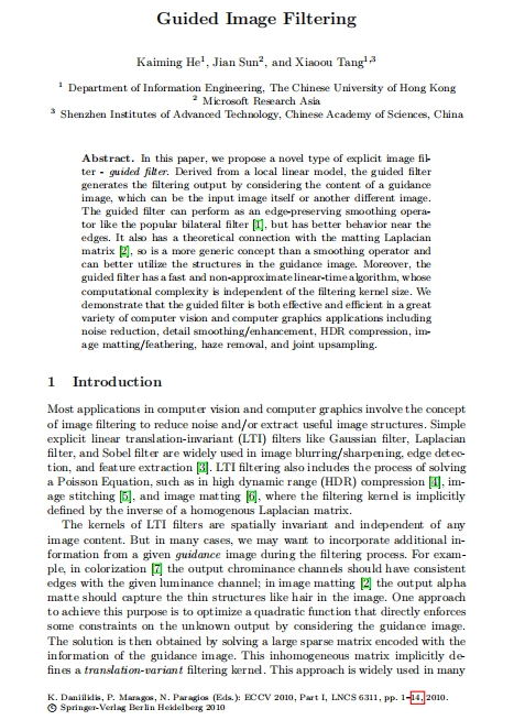 In this paper, we propose a novel type of explicit image filter - guided filter. Derived from a local linear model, the guided filter generates the filtering output by considering the content of a guidance image, which can be the input image itself or another different image.